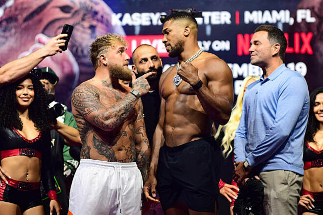 Бывший чемпион мира в супертяжелом весе (свыше 90,7 кг), британец Энтони Джошуа (28–4, 25 КО) и популярный американский ютубер Джейк Пол (12–1, 7 КО) взвесились накануне боя.