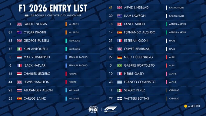 Среди других изменений выделяется молодой пилот системы Ред Булл Арвид Линдблад, который выбрал номер 41. Остальные гонщики остались со своими привычными номерами, в частности пилоты Кадиллак Серхио Перес (11) и Валттери Боттас (77), которые пропустили сезон-2025. Полный список номеров представлен на изображении ниже.