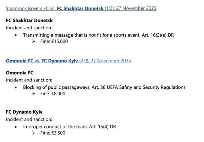 Киевляне в свою очередь потеряли 3500 евро за «ненадлежащее поведение команды» в игре того же тура Лиги конференций против «Омонии» (0:2).