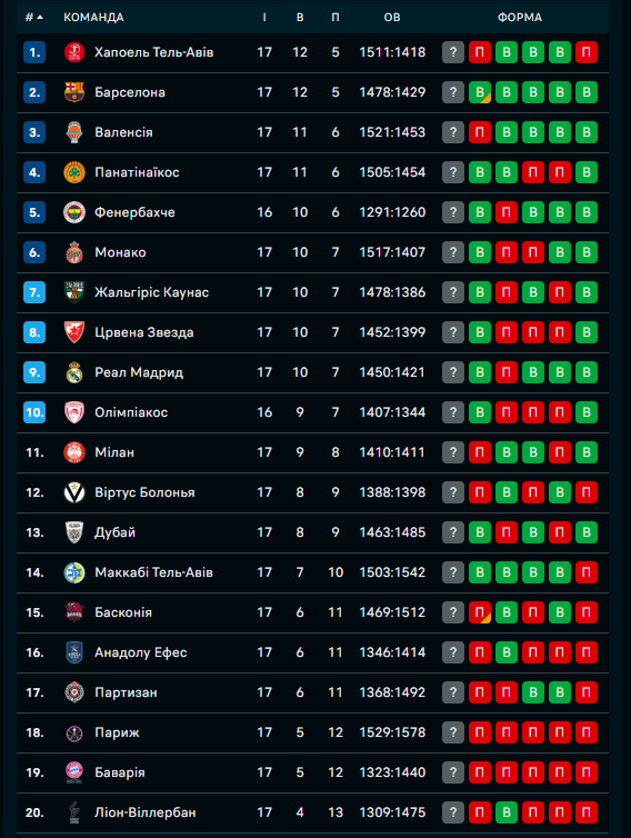 19 декабря состоялось шесть матчей 17-го тура регулярного чемпионата Евролиги.