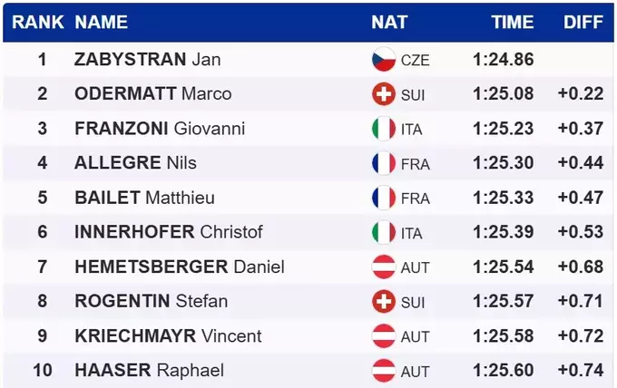 27-летний Ян Забистран опередил на 0.22 секунды лидера Марко Одерматта и впервые в карьере финишировал на первой ступени пьедестала Кубка мира.