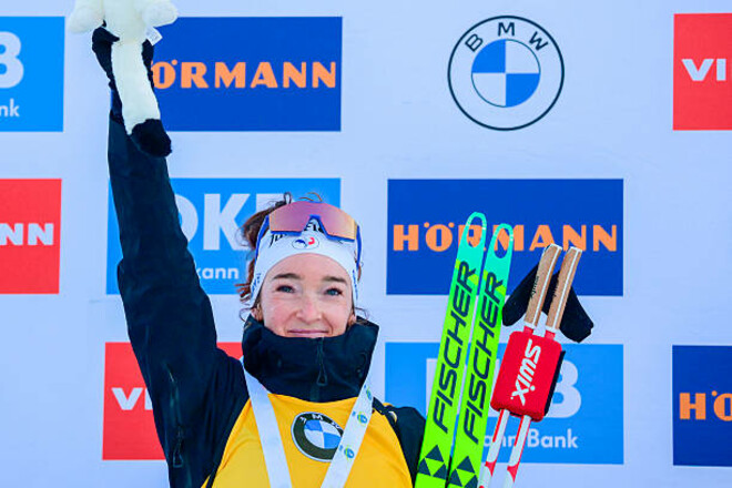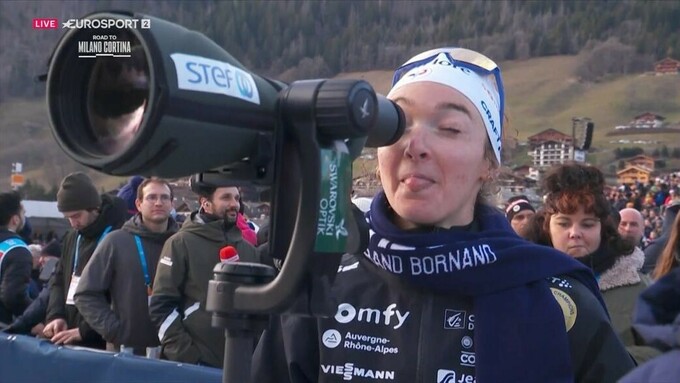 Французская биатлонистка Лу Жанмонно в прямом эфире следила за ходом событий мужского масс-старта на третьем этапе Кубка мира в Анси (Франция).