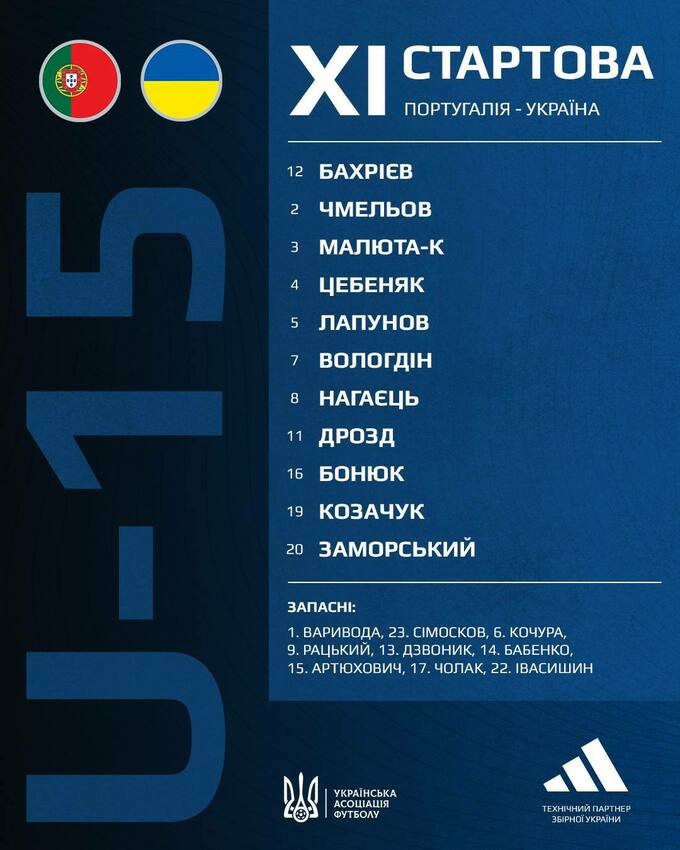 Украина U-15: Бахриев, Чмелев (Дзвоник, 72), Малюта (к) (Артюхович, 72), Цебеняк, Лапунов, Вологдин, Нагаец (Кочура, 68), Дрозд (Рацкий, 72), Бонюк (Ивасишин, 72), Козачук (Бабенко, 78), Заморский (Чолак, 68).
