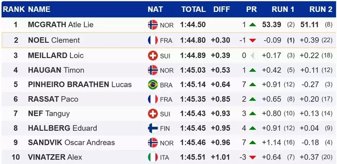 Для норвежца этот триумф стал дебютным в текущем сезоне. Вторым финишировал француз Клеман Ноэль, который утратил лидерство и уступил победителю 0.3 секунды.