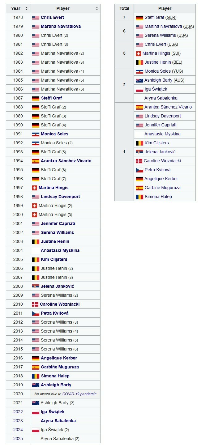 Все чемпионы мира по теннису по версии ITF (женщины)