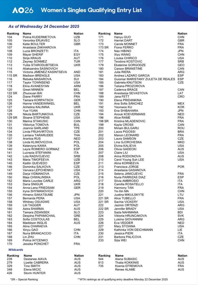 Заявочный лист на квалификацию Australian Open 2026 (женщины)