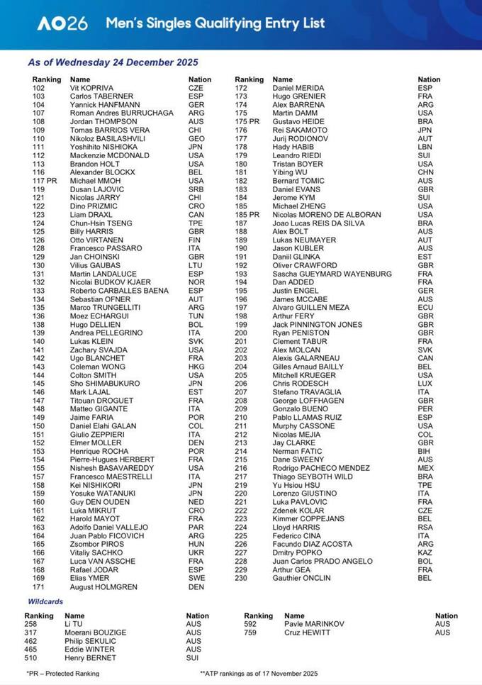 Заявочный лист на квалификацию Australian Open 2026 (мужчины)