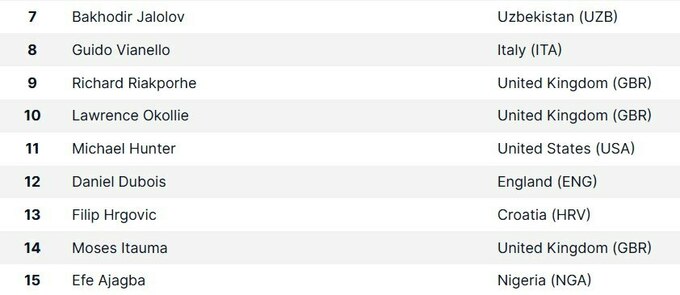 Непобежденный британец Мозес Итаума (13–0, 11 КО) продолжает свое падение и теперь опустился уже на 14-ю позицию – ранее боксер отказался драться в претендентском поединке и был наказан организацией.