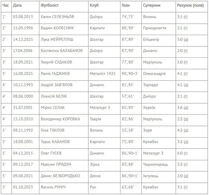 Примечание. В источнике (офиц. сайт УПЛ) допущена ошибка: первый гол Лука Мейреллиш забил на 85-й минуте, а не 87-й. Диапазон между его голами на самом деле составил 4 минуты, а не 2.