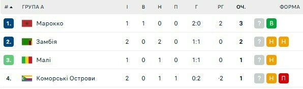 Турнирное положение в группе A: Марокко (3 очка), Замбия (2), Мали, Коморы (по 1).