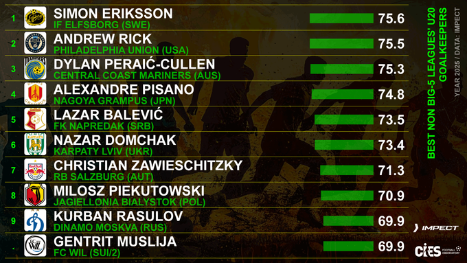 18-летний украинец вошел в десятку лучших молодых голкиперов мира по версии CIES среди футболистов, родившихся в 2006 году и позже, которые выступают вне топ-5 лиг Европы.