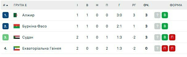 Турнирное положение в группе E: Алжир, Буркина-Фасо, Судан (по 3 очка), Экваториальная Гвинея (0).