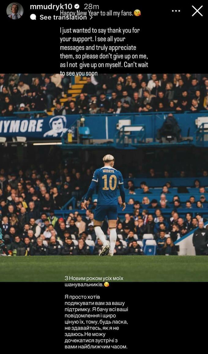Я вижу все ваши сообщения и искренне ценю их, поэтому, пожалуйста, не сдавайтесь. Не могу дождаться встречи с вами в ближайшее время», – написал Мудрик.