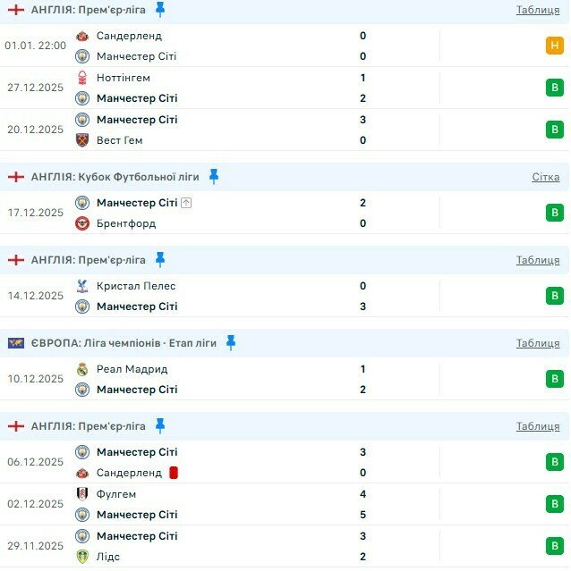 - 17.12.2025. Манчестер Сити – Брентфорд – 2:0 (Кубок английской лиги)