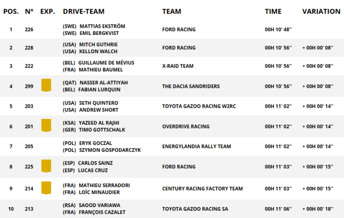 Лучший результат в коротком стартовом спецэтапе показал двукратный чемпион DTM, Маттиас Экстрём, который принес Форду идеальное начало самого тяжелого ралли в мире.