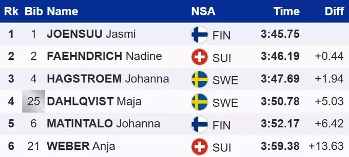 Неожиданно первой финишировала финская лыжница Ясми Йонсу, которая ранее ни разу не поднималась на высшую ступень пьедестала.