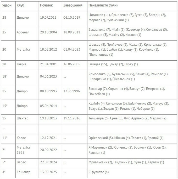 Самые длинные серии реализации пенальти игроками одного клуба в чемпионатах Украины