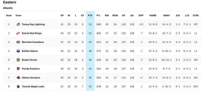 Детройт, который недавно впервые за 10 лет стал лидером Востока на дистанции середины сезона, уже потерял первое место. Крылья проиграли Питтсбургу, а на первое место конференции вышла Тампа-Бэй.