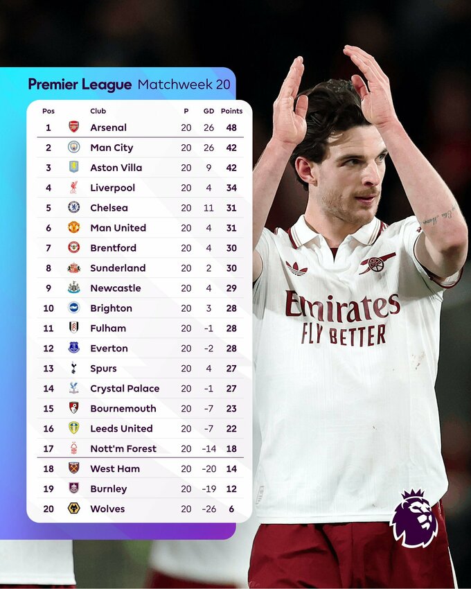 Топ-6 АПЛ: Арсенал (48 очков), Манчестер Сити, Астон Вилла (по 42), Ливерпуль (34), Челси, Ман Юнайтед (по 31).