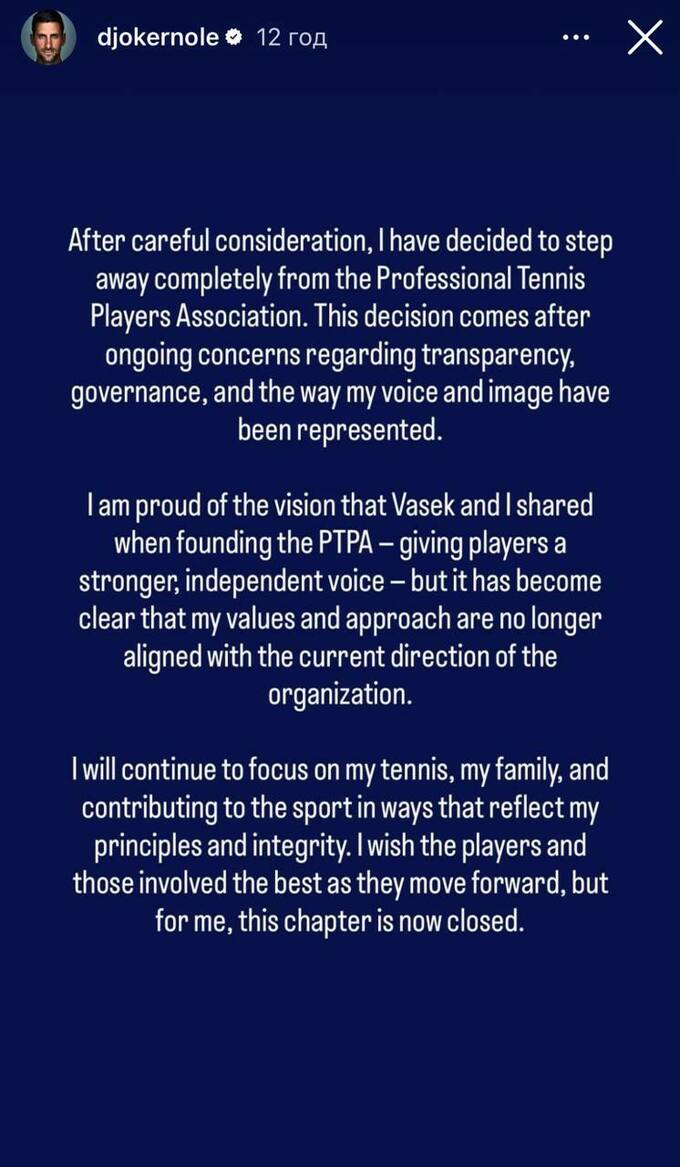 «После тщательного обдумывания я принял решение полностью выйти из Ассоциации профессиональных теннисистов. Это решение связано с продолжающимися вопросами к прозрачности, управлению и тому, как были представлены мой голос и мой образ.