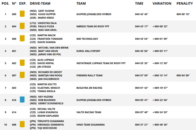 В классе грузовиков победу на этапе одержал экипаж Герта Гузинка, Хьюго Куппера и Марио Кресса, представляющий Kuipers Jongbloed Hybrid. Нидерландско-немецкая команда показала время 4:42:45. Второе место с отставанием в 32 секунды заняли Вайдотас Жала, Паулу Фиуза и Макс ван Грол из Nørdis Team De Rooy FPT. Тройку лучших замкнул экипаж Мартина Мацика, Франтишека Томашека и Давида Сванда из команды MM Technology, которые проиграли лидерам 1 минуту 9 секунд.