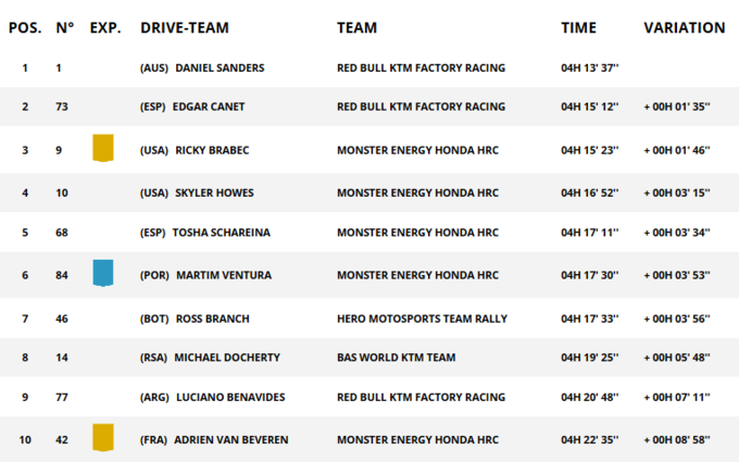 В классе мотоциклов такого масштабного изменения расклада сил не было. Победу на этапе одержал Даниэль Сандерс, который уверенно привел к финишу байк Red Bull KTM со временем 4:13:37. Его напарник по команде Эдгар Канет, выигравший пролог и первый этап, финишировал вторым, уступив лидеру 1 минуту 35 секунд, оформив таким образом дубль для заводской КТМ. Третье место занял представитель Monster Energy Honda HRC Рики Бребек, который отстал от Сандерса на 1 минуту 46 секунд, замыкая подиум в напряженной борьбе.