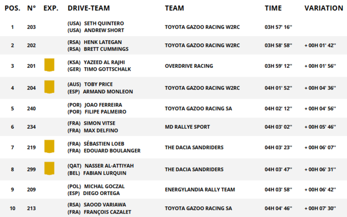 Лучшим среди не Тойота стал Себастьян Лёб, который финишировал шестым на Dacia Sandrider, проиграв победителю шесть минут. Сразу за ним расположился его напарник Нассер Аль-Аттия, который потерял время в первой трети этапа, но сумел отыграть позиции.
