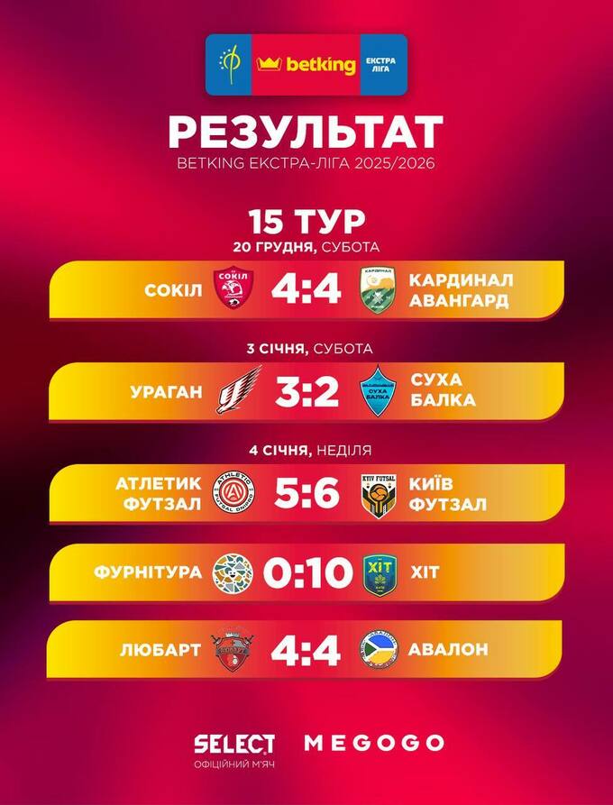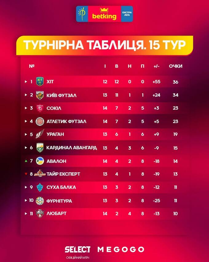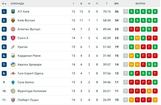 ХИТ после разгрома Фурнитуры (10:0) сохранил статус единственной непобежденной команды (36 очков). Вторую позицию занимает Kyiv Futsal (34 балла) после победы над Атлетиком из Днепра (6:5).