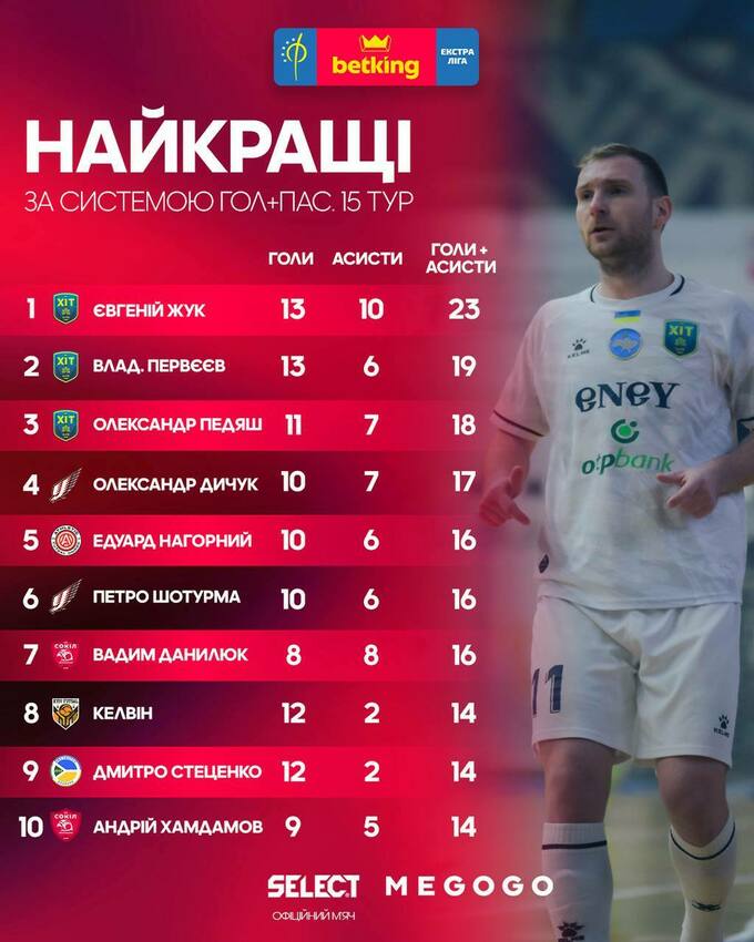 В рейтинге самых результативных игроков по системе гол + пас впереди трио из клуба ХИТ. Евгений Жук (13+10), Владислав Первеев (13+6) и Александр Педяш (11+7) на троих забили более половины всех мячей команды.