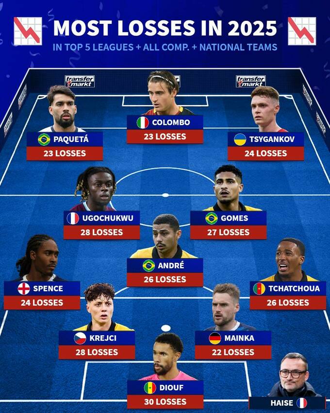Символическая сборная: наибольшее количество поражений в 2025 году (Transfermarkt)