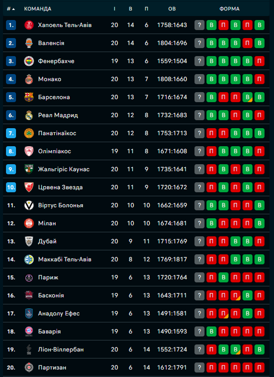 Во вторник, 5 января, состоялось восемь матчей 20-го тура регулярного чемпионата Евролиги.