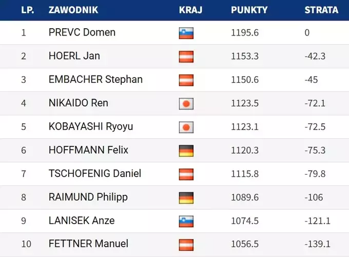 Вторым в рейтинге финишировал Ян Херль – отставание составило 42,3 балла, третье место занял Штефан Эмбахер.