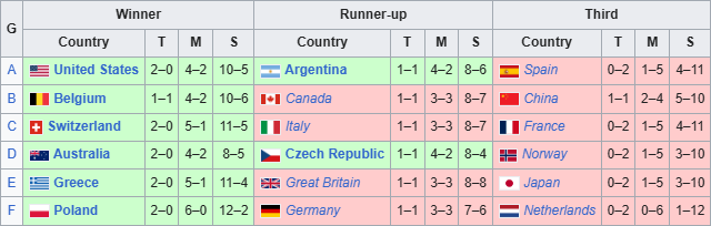 В четвертьфинал соревнований, как победители групп вышли: США, Бельгия, Швейцария, Австралия, Греция и Польша.