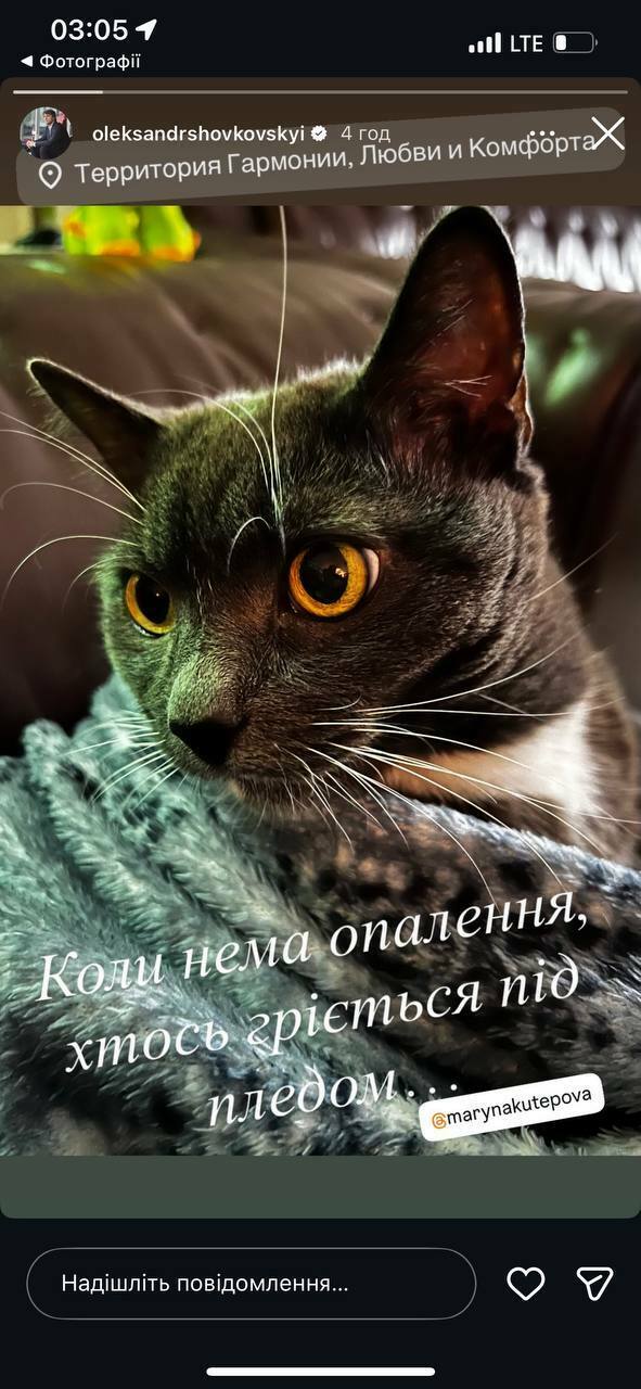 На снимке – домашний кот, укутанный в плед и пытающийся согреться в квартире. Кадр Шовковский сопроводил короткой, но красноречивой подписью: «Когда нет отопления, кто-то греется под пледом…». В публикации он также отметил свою супругу – Марину Кутепову.