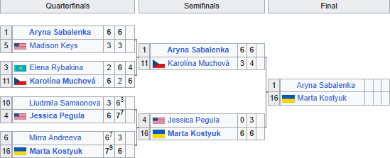 Соболенко в полуфинале переиграла Каролину Мухову, а Костюк разгромила Джессику Пегулу.