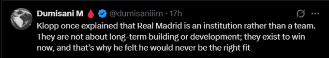 Dumisani M: Клопп однажды объяснил, что «Реал» Мадрид – это скорее организация, чем команда. Они не стремятся к долгосрочному развитию или построению; они существуют для того, чтобы побеждать сиюминутно, и именно поэтому он чувствовал, что никогда не подойдёт для этой команды.