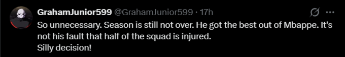 GrahamJunior599: Так делать не нужно. Сезон еще не закончился. Он выжал из Мбаппе максимум. Не его вина, что половина команды травмирована. Глупое решение!