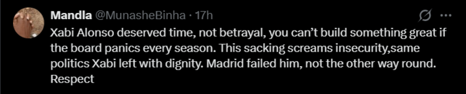 Mandla: Хаби Алонсо заслужил время, а не предательство. Нельзя построить что-то великое, если руководство паникует каждый сезон. Это увольнение кричит о неуверенности, та же самая политика, которую Хаби оставил с достоинством. Мадрид подвел его, а не наоборот. Респект.