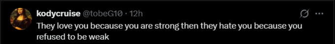 kodycruise: Они любят тебя за то, что ты сильный, а ненавидят за то, что ты отказался быть слабым.
