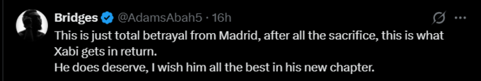 Bridges: Это просто полное предательство со стороны Мадрида, после всех жертв, вот что Хаби получает взамен. Я желаю ему всего наилучшего на его новом этапе.