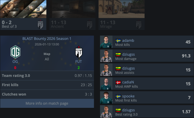 Таким образом, OG завершили свое выступление на BLAST Bounty, тогда как FUT Esports продолжают борьбу на первом tier-1 турнире 2026 года.