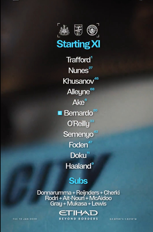 Ман Сити: Траффорд, Матеус Нунес, Хусанов, Аллейн, Аке, Бернарду Силва, Нико О'Райли, Семеньо, Фоден, Доку, Холанд