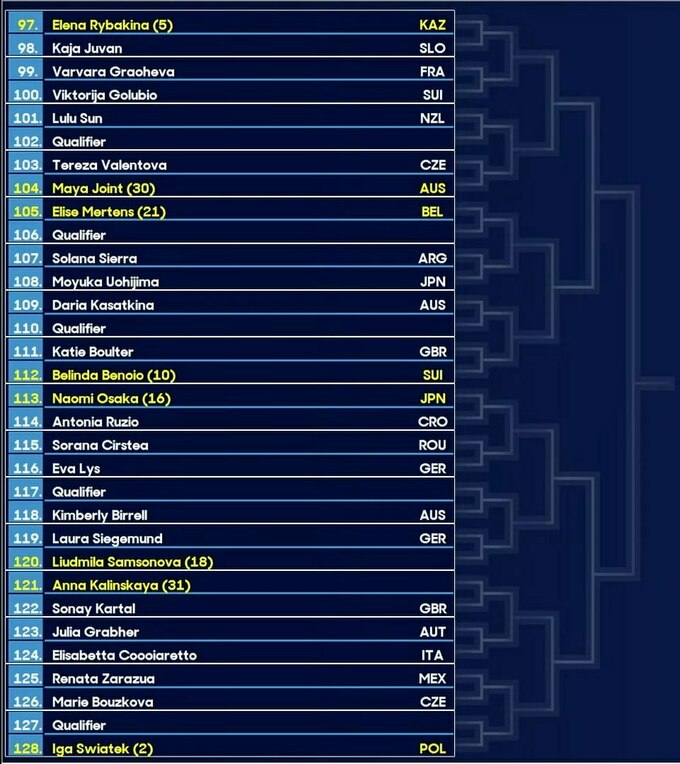 Первая сеяная Aus Open и первая ракетка мира Арина Соболенко стартует с матча против Тианцоа Сара Ракотоманга Раджаона. Ига Свентек со вторым номером посева в первом круге встретися с квалифайером.