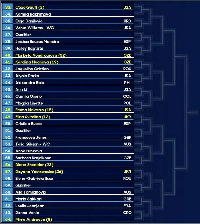 Якщо ж говорити про сітку загалом, то цьогоріч дами по ній розподілені на диво рівномірно. Немає жодної фаворитки, про яку можна сказати як зазвичай "розстелена червона доріжка до фіналу". Тож буде цікаво)