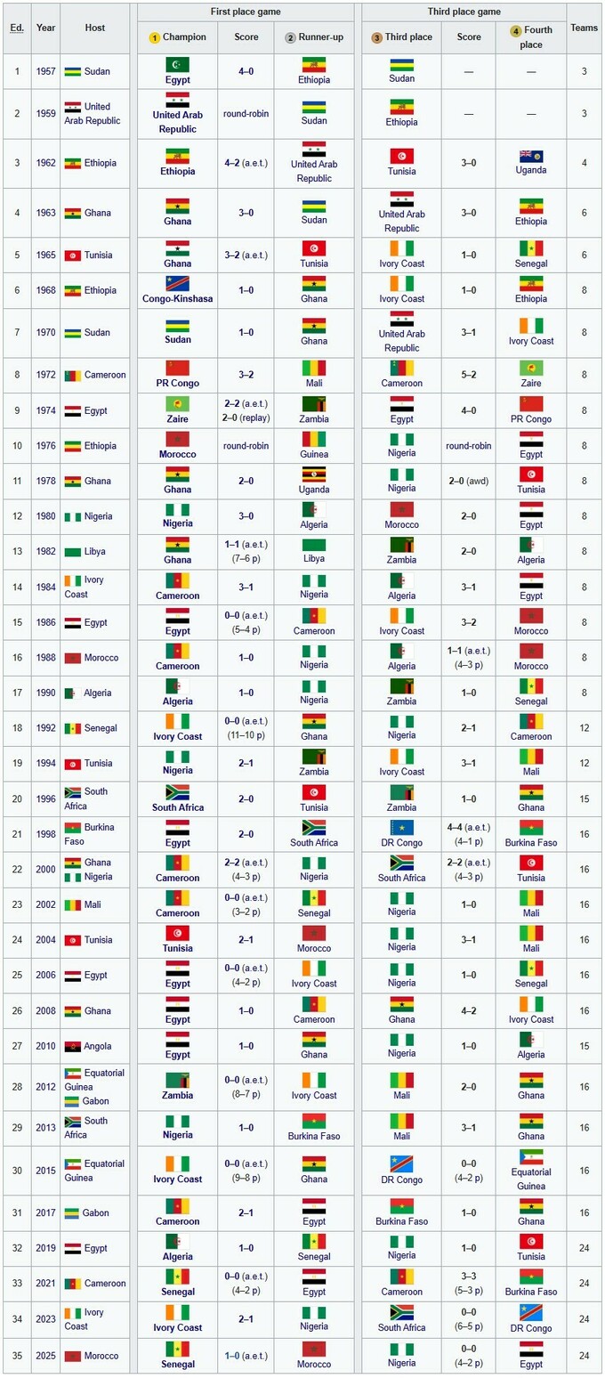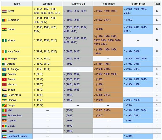 Количество титулов КАН: Египет (7), Камерун (5), Гана (4), Нигерия, Кот-д'Ивуар (по 3), Сенегал, Алжир, ДР Конго (по 2), Замбия, Тунис, Марокко, Судан, ЮАР, Эфиопия, Конго (по 1).