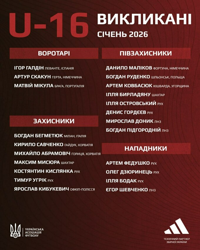Юношеская сборная Украины U-16 объявила заявку на турнир в Турции