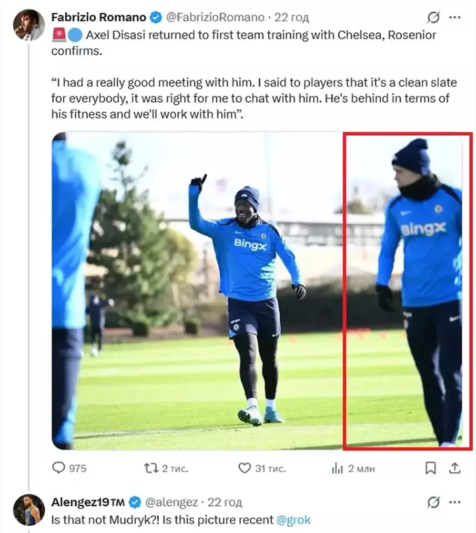Фабрицио Романо случайно вызвал много шума в соцсетях, опубликовав фото, где рядом с Дисаси тренируется игрок, очень похожий на Михаила Мудрика. В комментариях началось настоящее «расследование» – действительно ли это украинский вингер и свежее ли фото.
