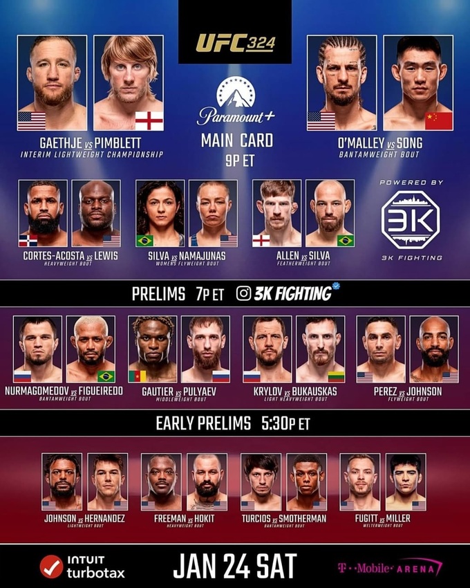 Джастин Гейджи – Пэдди Пимблетт. Полный кард UFC 324 в Лас-Вегасе