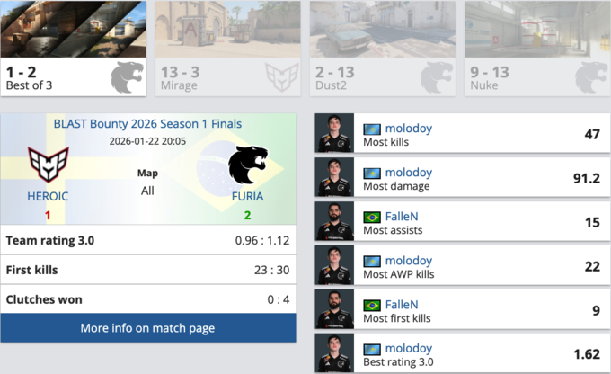 Таким образом, FURIA оформила волевую победу и вышла в полуфинал BLAST Bounty, тогда как HEROIC покидают турнир, не реализовав убедительное преимущество после первой карты.