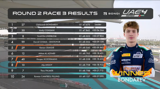 Состоялась финальная гонка второго этапа Формулы-4 Ближнего Востока (UAE4). В престижном межсезонном чемпионате участвует украинский пилот Александр Бондарев – юниор академии команды Ф1 «Уильямс Рейсинг» и гонщик Mumbai Falcons.
